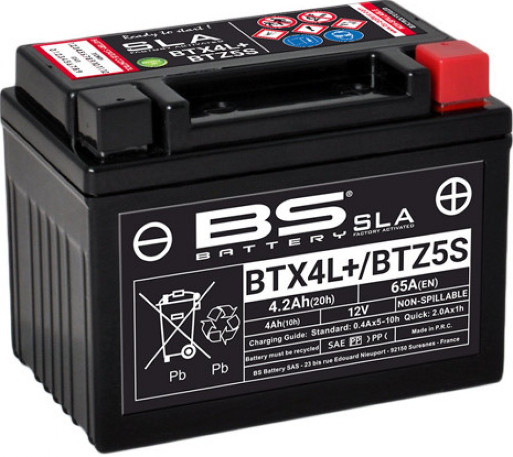 Ve výrobě aktivovaný SLA akumulátor (VRLA, AGM za mokra nabitý), značení dle normy JIS YTX4L (FA), 12V 4,2Ah CCA 65A, Rozměry 113x70x85mm, Maximální náklon 90°.