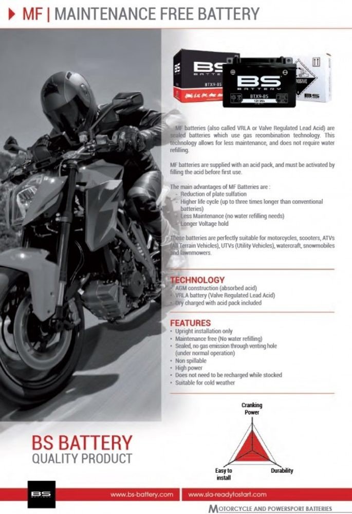 Uzavřené bezúdržbové baterie, které využívají technologii plynové rekombinace. Tato technologie snižuje nutnost údržby, protože není nutné doplňovat vodu. Baterie je dodávána spolu s kyselinou, kterou je potřeba před první použitím nalít, a tím baterii aktivovat. Tyto baterie jsou vhodné pro motocykly, skútry, čtyřkolky, ale i sněžné skútry nebo plavidla.