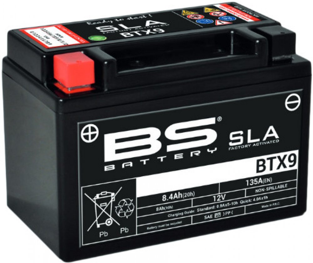 Ve výrobě aktivovaný SLA akumulátor (VRLA, AGM za mokra nabitý), značení dle normy JIS YTX9.