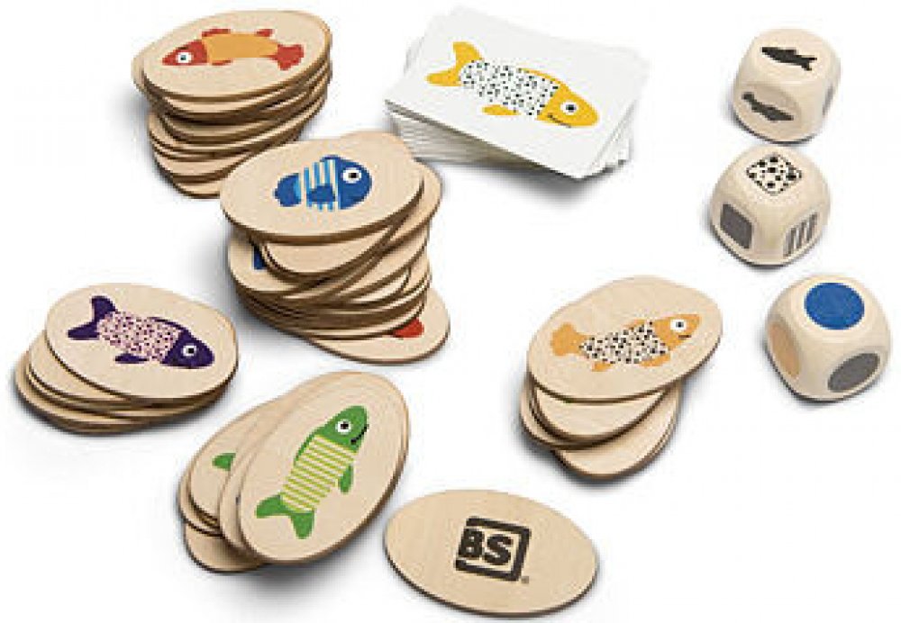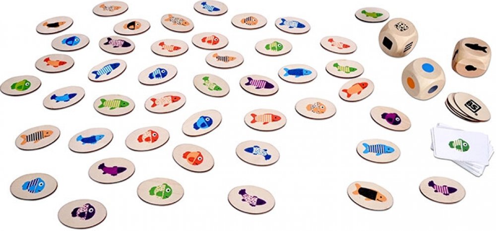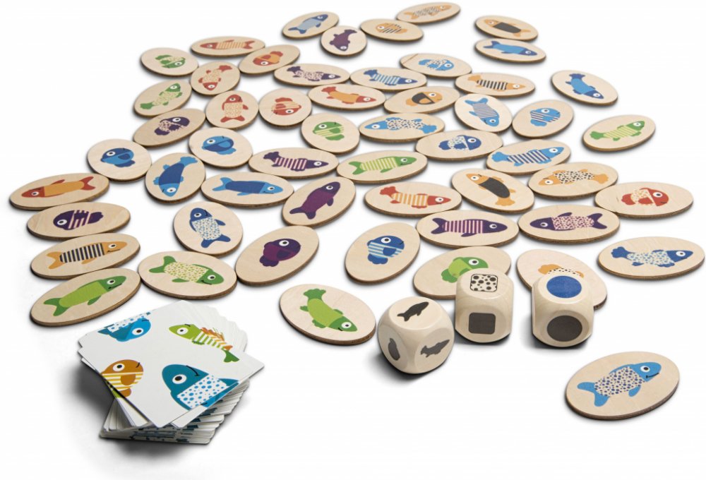 Hra obsahuje: 54 ryb, 6 x 4 x 2,6 cm, 54 karet, 7,5 x 5,5 cm, 3 kostky.