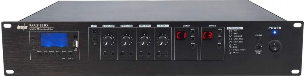 Multiroom zesilovač s Bluetooth, FM tunerem a MP3 přehrávačemObjevte maximální flexibilitu ozvučení s tímto 2-zónovým multiroom matrix zesilovačem, který je ideálním řešením pro restaurace, penziony, wellness centra či obchodní provozy. Díky integrované podpoře USB/microSD/MP3 přehrávání, Bluetooth 5.0 připojení, FM tuneru a praktickému dálkovému ovladači si můžete vybrat z široké škály hudebních zdrojů a směřovat je do jedné nebo druhé zóny. Každá ze zón má samostatný monofonní výstup o výkonu 120 W, což umožňuje přehrávání rozdílných zdrojů současně.Zesilovač nabízí 5 zdrojů signálu (4 vstupy + MP3 přehrávač), které lze nezávisle nasměrovat do požadované zóny. V případě potřeby silnějšího výkonu můžete každou zónu snadno rozšířit pomocí výstupu LINE OUT pro externí zesilovač. S volitelnými nástěnnými ovladači PA2500SV získáte přímou kontrolu v jednotlivých místnostech – včetně volby zdroje, hlasitosti a Bluetooth spárování. Systém podporuje až 8 pagingových mikrofonů PA2500RM s možností výběru zóny hlášení, přičemž všechna zařízení se propojují jednoduše přes CAT6 kabel (RJ45) až do vzdálenosti 200m.Technické specifikace:Výkon: 2× 120 W RMS / 100V, 8–16 ΩVstupy: 3× Mic/Line (XLR/Jack 6,3 mm) se zapínatelným fantomovým napájením 48 V (Mic1 má prioritu), 1× stereo AUX (RCA), 1× EMC (RCA)Bluetooth 5.02 regulovatelné monofonní výstupní zónyKaždý vstup lze nasměrovat do vybrané zóny pomocí 2 tlačítekSamostatné 2-pásmové korekce pro každý vstupNastavitelná citlivost vstupů + směrování do zónRCA monitorovací výstupNesymetrické signálové výstupy pro externí zesilovačeOchrana proti zkratu, přetížení, přehřívání a CLIPHarmonické zkreslení (THD): < 0,5 %Odstup signál/šum: > 85 dB (LINE), > 72 dB (MIC)Tento systém představuje ideální volbu pro všechny, kdo hledají profesionální, spolehlivé a snadno ovladatelné řešení pro zónové ozvučení s vysokou kvalitou zvuku.Prohlášení o shodě