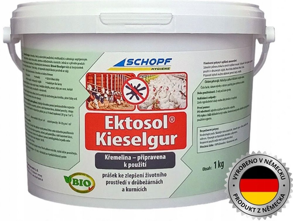 Velmi účinný BIO přípravek k prevenci proti čmelíkům u slepic, roztočům v peří drůbeže - klíšťatům, blechám, vším a dalšímu lezoucímu hmyzu - mravenci, rybenky, stínky, štěnice atd., 1000g koncentrátu = možnost aplikace formou postřiku, nátěru nebo rozptylu na plochu, s okamžitým účinkem, dlouhodobý účinek i po dešti, vhodný i pro BIO farmy, účinná látka 100% křemelina (diatomitová zemina).