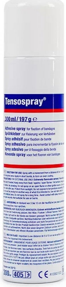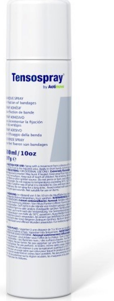 Tensospray to wysokiej jakości, mocny klej do tapingu, który zwiększa przyczepność tejpów na skórze, wydłuża trwałość aplikacji, a także chroni przed przypadkowym odklejeniem taśmy. Hipoalergiczna formuła kleju sprawia, że jest on bezpieczny w kontakcie ze skórą, nie wywołując podrażnień czy uszkodzeń naskórka. Produkt ten bez problemu można aplikować pod taśmy elastyczne, sztywne oraz podkłady. Szczególnie zaleca się go w przypadku tapingu rehabilitacyjnego, a także u osób z nadmierną potliwością lub zwiększonym wydzielaniem sebum. Opakowanie w formie sprayu, a także pojemność 300 ml wpływają na łatwość, szybkość oraz wydajność aplikacji.