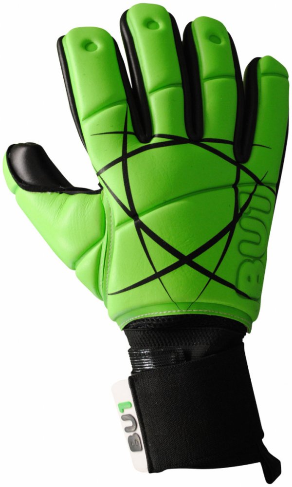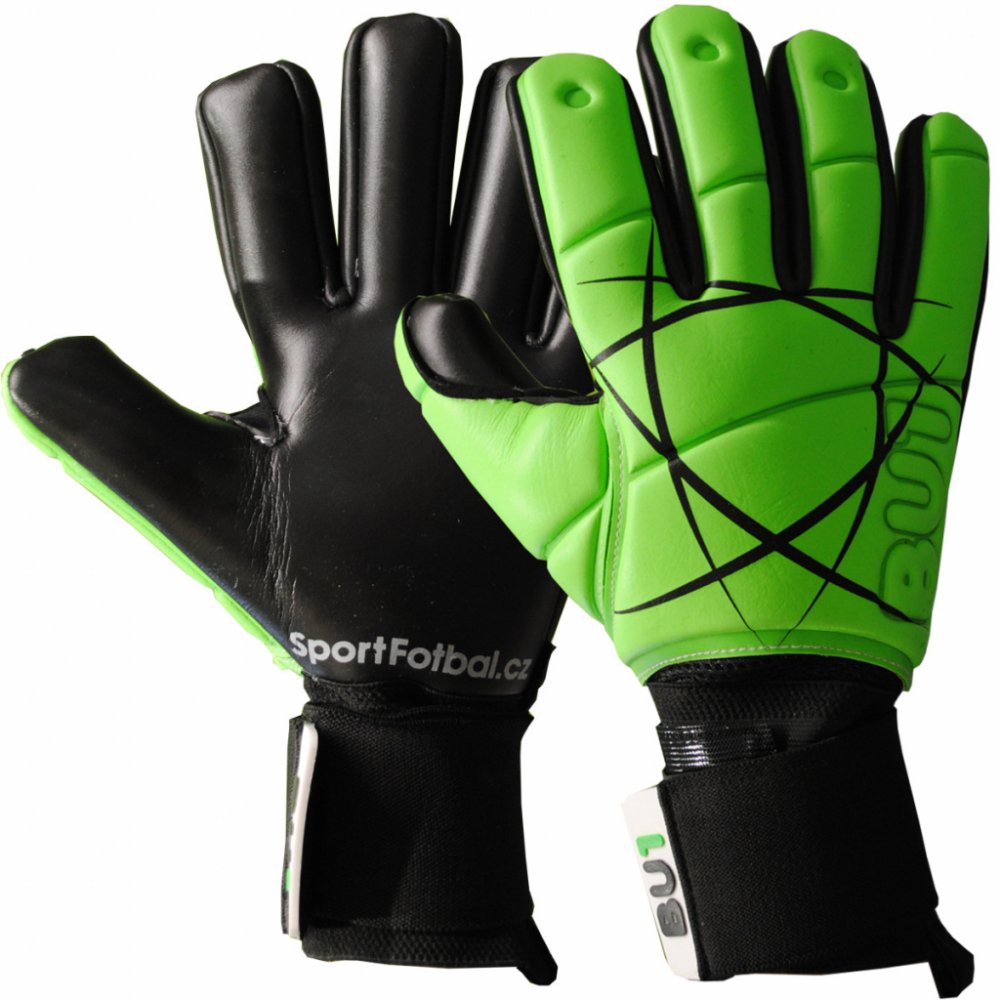 Unikátní brankářské rukavice BU1 s designem SportFotbal. Hřbet rukavice je světle zelený s grafickými prvky, které si berou inspiraci v logu SportFotbal. Logo BU1 je vyraženo klasicky na vrchní straně rukavice. Dlaň je celá černá a na spodku je nápis SportFotbal.cz