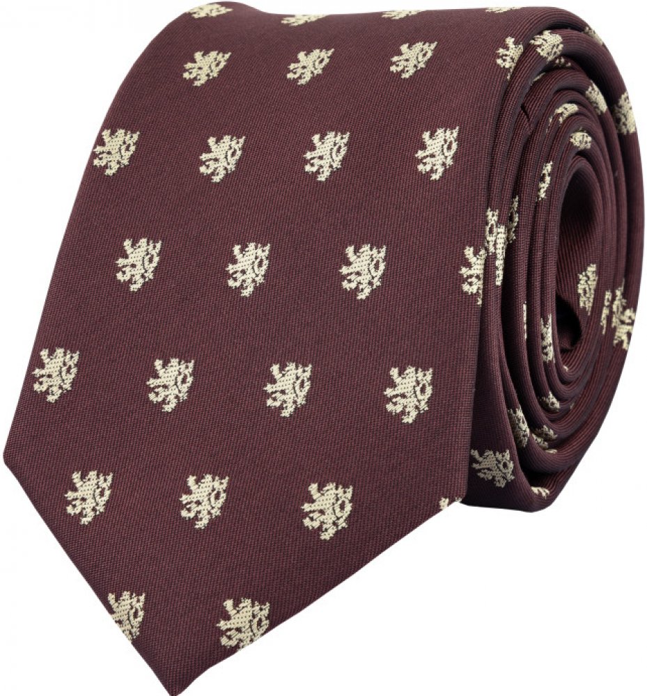 Vínová kravata se lvy stylově doladí váš outfit se sakem nebo oblekem. Skvěle se k ní budou hodit naše béžové kšandy. Osvěžte svůj oděv tímto hravým doplňkem! decentní dárek pro něj design inspirovaný českým státním znakem: lev zabaleno v dárkové krabičce Jak uvázat kravatu Délka kravaty: 148 cm V nejširším místě: 7 cm Materiál: polyester Pokyny pro péči: pouze suché čištění