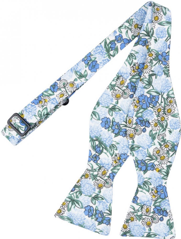 Modrý vázací motýlek Tessa s motivem lučního kvítí, sedmikrásek a jetele se zelenými lístky je veselé oživení Vašeho outfitu se sakem nebo oblekem. Perfektně se hodí k našim modrým a zeleným kšandám. Motýlka můžete doplnit i některým z našich kapesníčků do saka, které sjednotí celý vzhled. Je skvělým doplňkem na svatby, zahradní slavnosti i na jiné společenské události. Tohoto motýlka je sice pot...