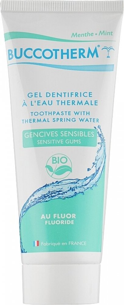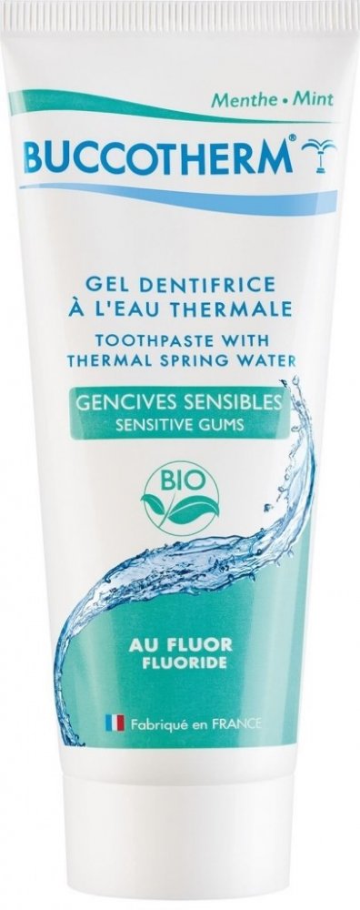 Mentolová zubní pasta obsahuje termální vodu a má vyvážené pH. Zklidňuje podráždění a citlivost dásní, redukuje jejich krvácení a působí protizánětlivě.Gelová zubní pasta Buccotherm Gel Dentifrice BIOobsahuje 52 % termální vody Castéra - Verduzamá vyvážené pH 8 zklidňuje podráždění a zánět v ústechredukuje krvácení dásní a jejich citlivostmá příjemnou mentolovou příchuťje doslazená extraktem ze stévieobsahuje přírodní ingredience (99 % přírodního původu, 20 % z ekologického zemědělství)je nositelem certifikátu COSMOSneobsahuje alkohol, SLS, syntetická barviva a parfemace, bez parabenů, cukru a umělých sladidelobsahuje fluorid sodný (1450 ppm), proto působí preventivně proti vzniku zubního kazuRDA