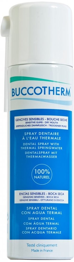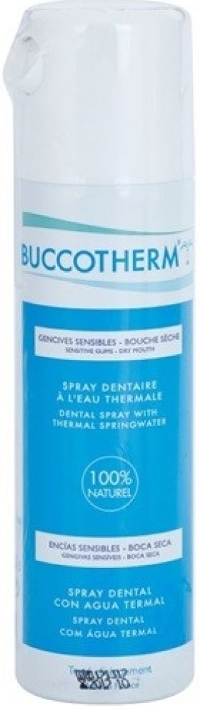 Buccotherm dentální sprej je určený pro každodenní péči. Obsahuje 100 % termální pramenité vody Castéra-Verduzan. Zklidňuje a osvěžuje citlivá a suchá ústa. Alkalické pH 8 snižuje tvorbu zubního plaku.Buccotherm dentální sprej je určený pro každodenní péči. Obsahuje 100 % termální pramenité vody Castéra-Verduzan. Zklidňuje a osvěžuje citlivá a suchá ústa. Alkalické pH 8 snižuje tvorbu zubního plaku. Praktická tryska vypláchne hůře dostupné prostory a je též vhodná k pečlivé hygieně fixních rovnátek. Vhodný i pro děti. Neobsahuje fluoridy a ani alkohol. Složení: Castera-Verduzan thermal aqua