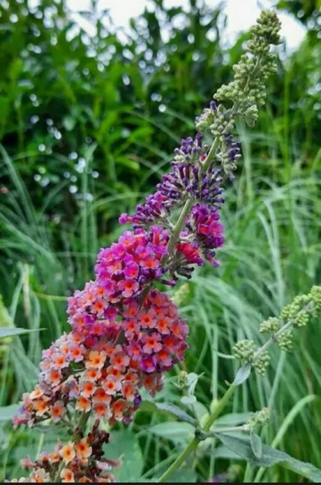 Nápadná dlouhá květenství s unikátním dvoubarevným efektem. Květy rozkvétají z oranžových až meruňkových poupat do růžových až purpurových tónů, takže na jednom latě jsou současně dvě barvy. Kvete bohatě od července do září, při odstraňování odkvetlých lat nakvétá dlouho. Květy jsou voňavé a silně lákají motýly.
