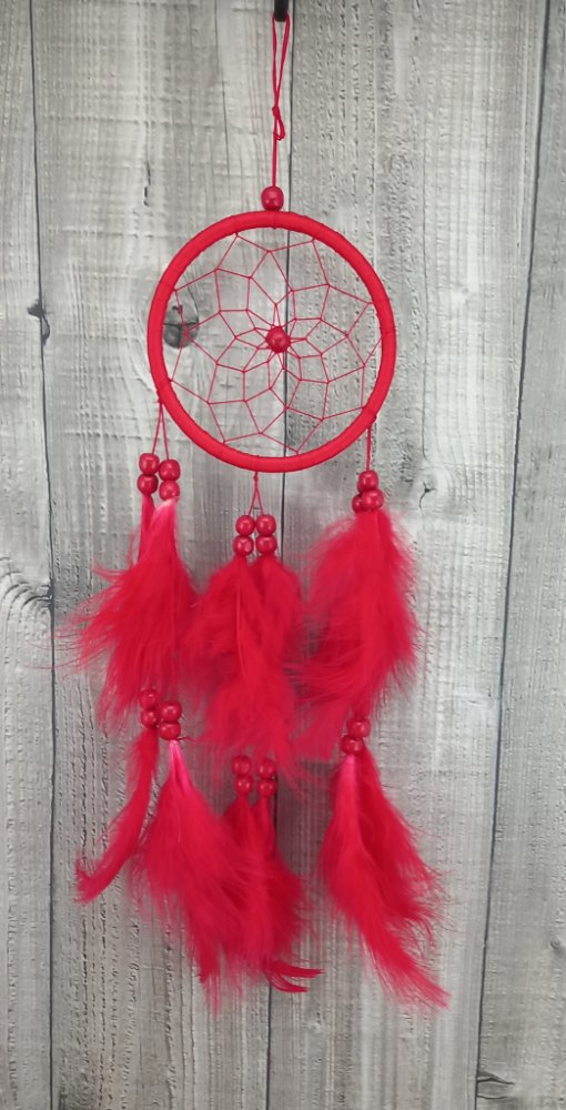 Lapač snů malý červený má kroužek o průměru 11 cm a celkovou délku 45 cm. Je vyroben z kovového kroužku, dřevěných korálků, peří a polyesterové nitě. Červená barva symbolizuje vášeň, energii a sílu, podporuje odvahu a pozitivní emoce. Může být vhodný pro vzletné povahy, které chtějí realizovat své nápady a projekty.