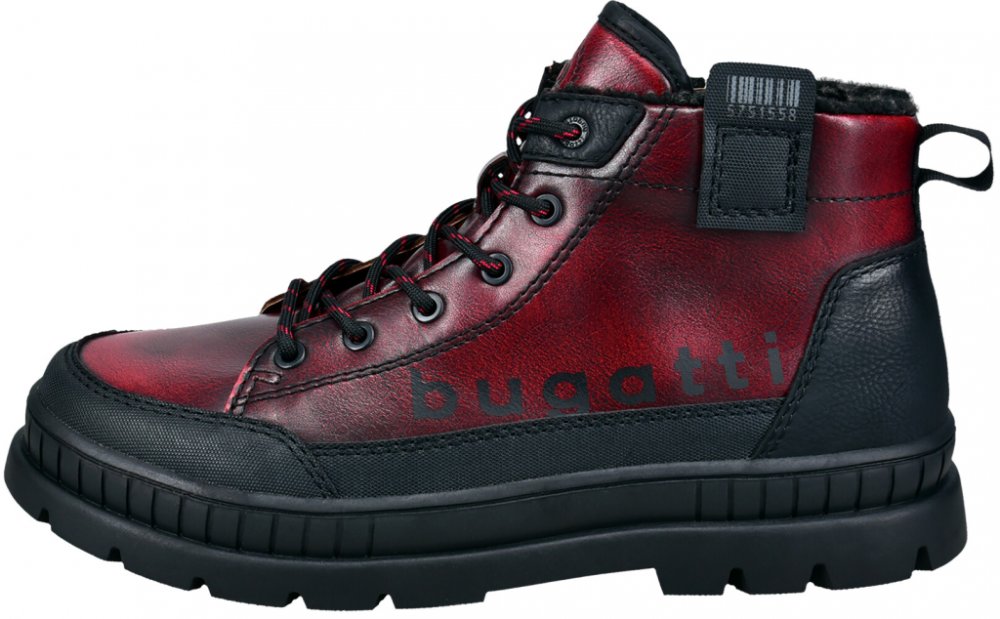 Pánské kotníkové boty Bugatti na pohodlné platformě. Kombinace černé podešve se červeným vzorem zaujme na první pohled. Díky zipu po straně se dobře obouvají.