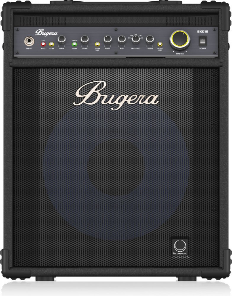 Bugera BXD15A - 1000W baskytarový zesilovač s originálním 15" britským hlíníkovým reproduktorem Turbosound, předzesilovačem MOSFET, kompresorem a technologií DYNAMIZER. Turbosound je přední britský světový výrobce profesionálních reproduktorů, který se na trhu pohybuje více než 30 let a mnohokrát získal cenu Queen’s Award for Innovation.