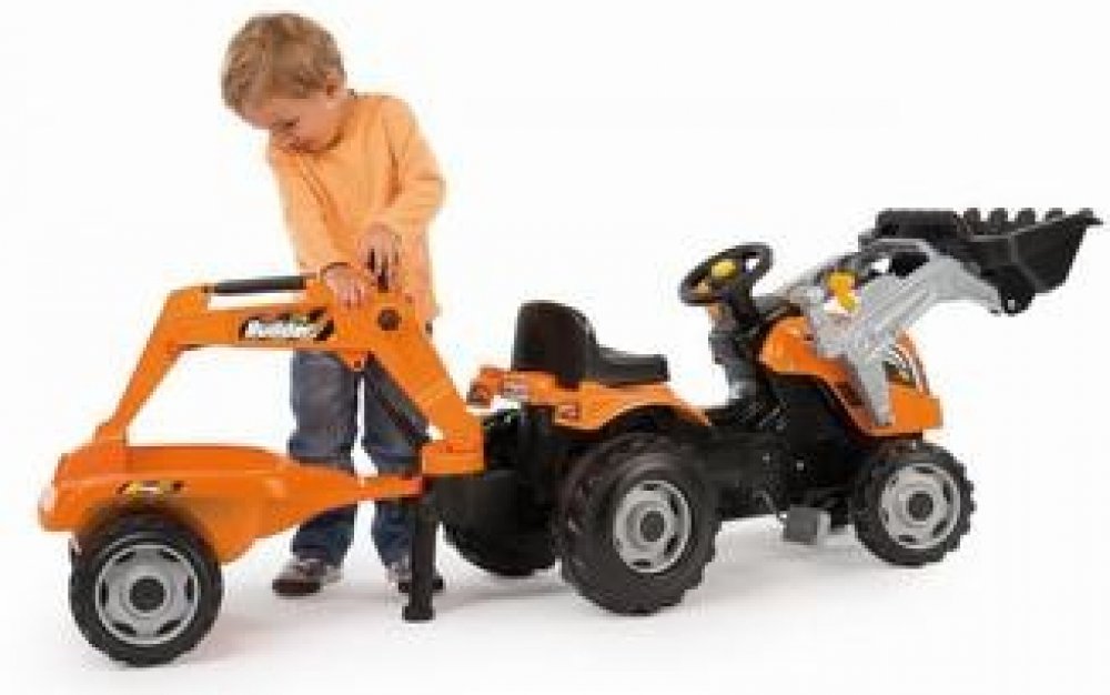Dětský šlapací traktor s funkčím nakladačem a odpojitelným vozíkem.