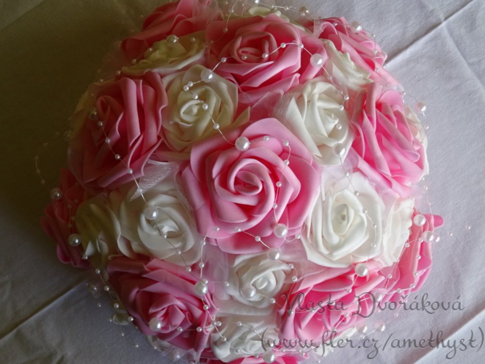 Polystyrenový základ s 26 pěnovými růžemi, perličkami a vpichovanou organzou.