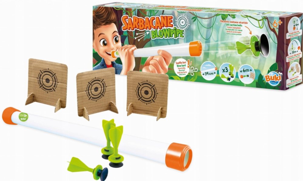 Obsahuje:Foukačku 39cm dlouhou3 šipky s gumovou přísavkou3 terče z kartonu