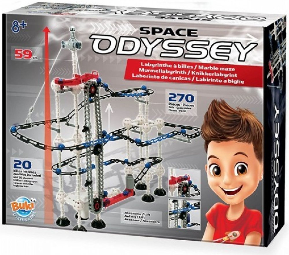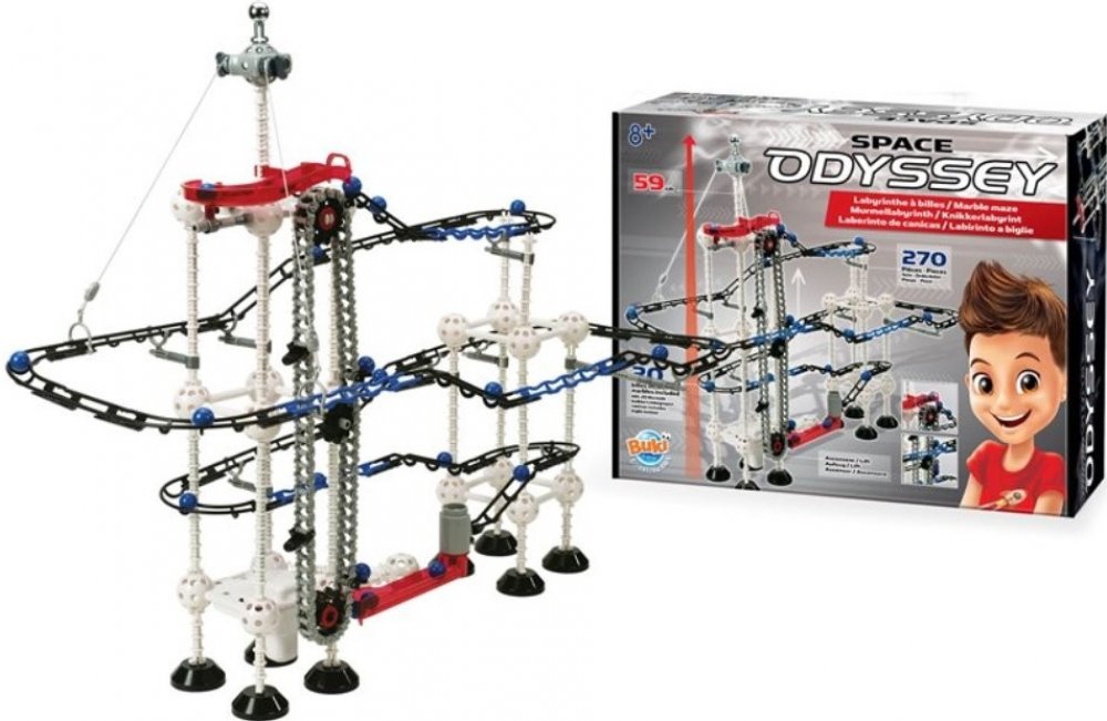 Kuličková dráha Space ODYSSEY je velmi atraktivní stavebnice, která umožňuje množství různých variant sestavení. K dispozici je velké množství součástek, díky kterým můžete sestrojit nosné věže, úchyty, kolejnice a hlavně výtah pro nekonečný koloběh kuliček.