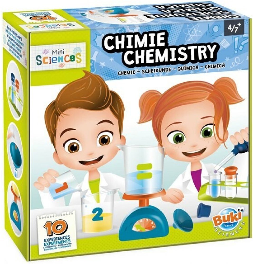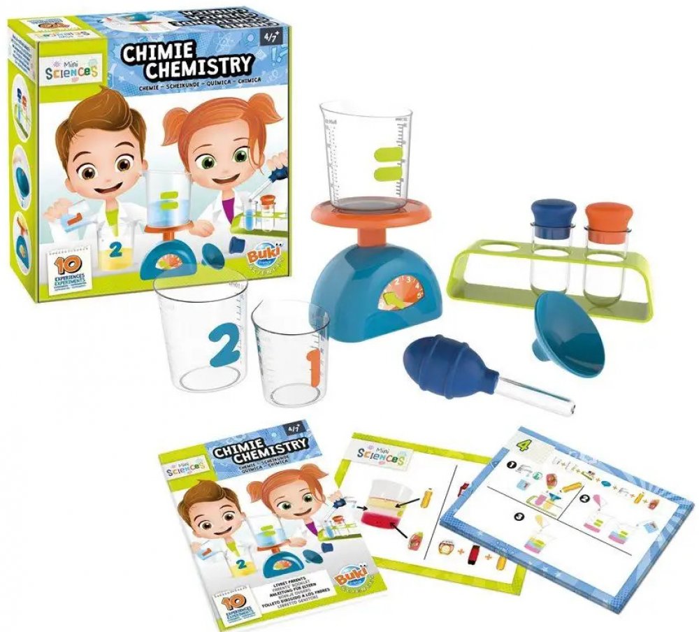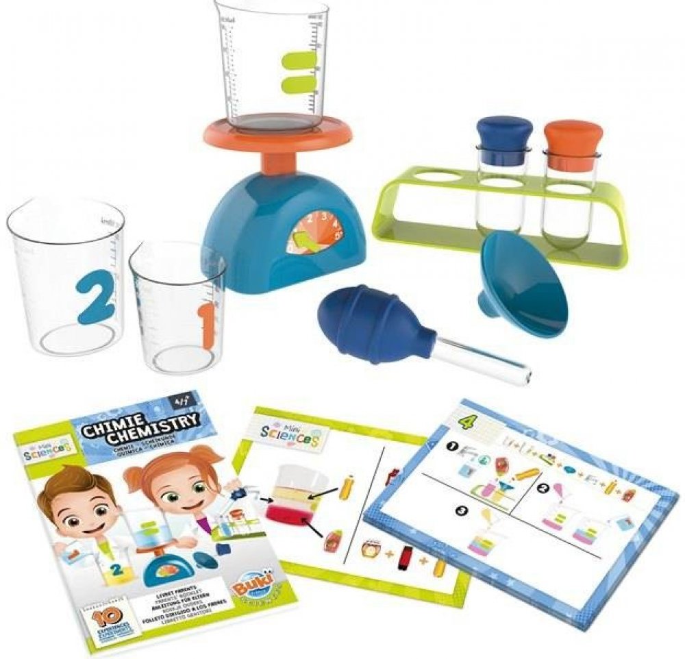 Chemická laboratoř ze série MiniScience je určena pro ty nejmenší badatele ve věku od 4 let. Jednotlivé pomůcky jsou dostatečně velké a jednoduché k použití. Součástí laboratoře je váha, kádinky, zkumavky se stojánkem, pipeta, trychtýř a 10 obrázkových karet s popsanými pokusy.