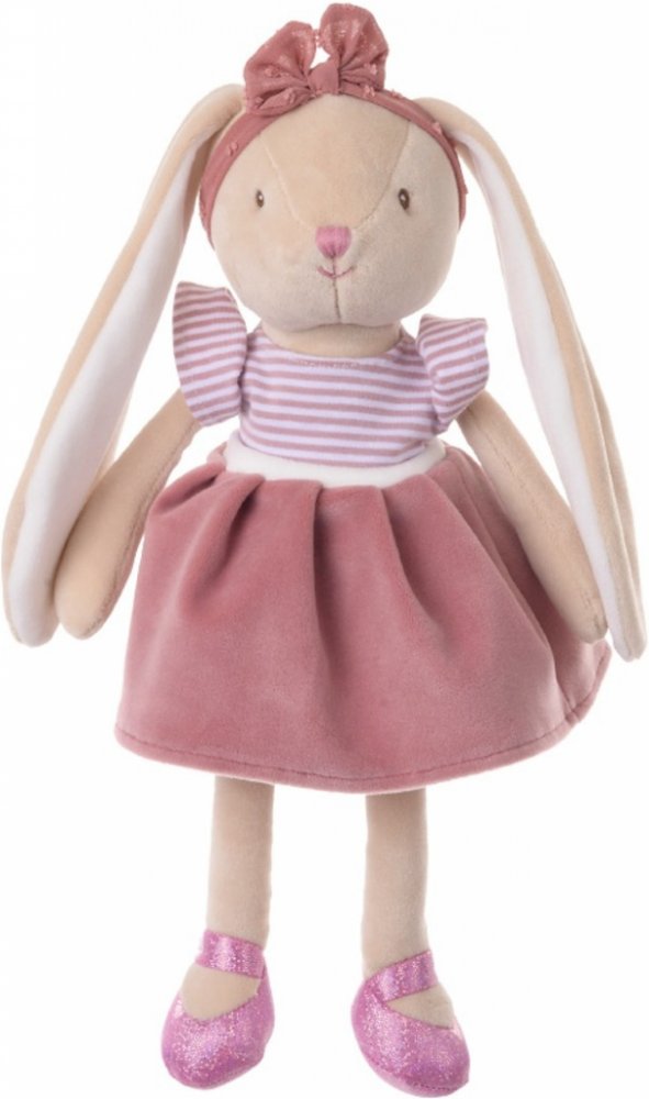 Seznamte se s jednou z králičích sester od značky Bukowski Design, rozkošnou plyšovou slečnou, která touží najít dvounohou kamarádku pro společné dobrodružství. Oblečená ve fialových šatech, pruhovaném topu a s dlouhými hebkými oušky láká k pomazlení. Šatičky je možné svléknout a vyměnit za vlastní outfit :-).