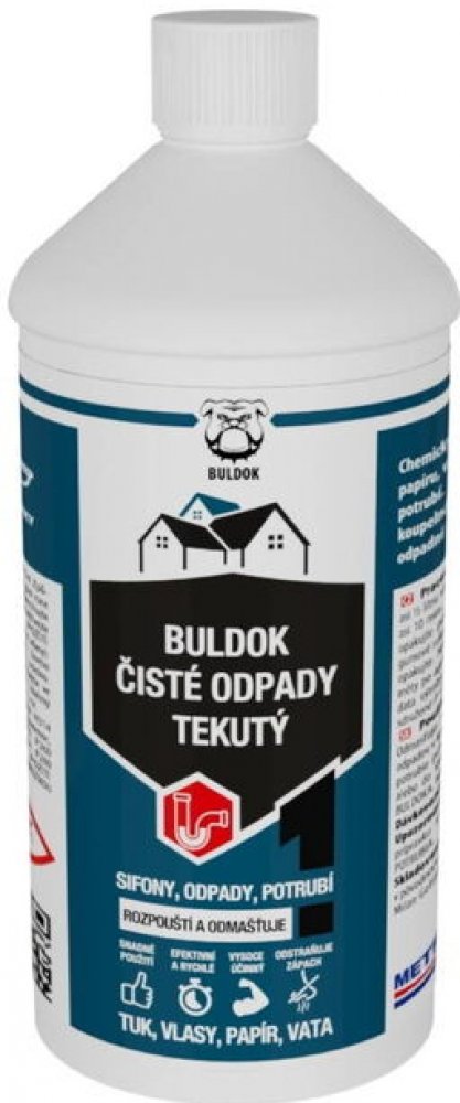 Buldok Čisté odpady tekutý chemicky rozpouští organické zbytky včetně vlasů, papíru, vaty. Odmašťuje a zprůchodňuje odpadní sifony a potrubí. Používá se při zanesení odpadů v kuchyních, koupelnách, prádelnách apod. Preventivně udržuje odpadní potrubí průchodná.PoužitíČistí, odmašťuje, rozpouští vlasy a jiné organické zbytky v sifonech a domovních odpadech z kuchyní, koupelen apod.VlastnostiVelmi silný prostředek s vynikajícím výsledkemK přímému použití, bez nutnosti složité přípravyJednoduchá aplikace s výsledkem již za 10 minutZprůchodňuje odtok a eliminuje nepříjemné pachyTekutá forma přípravku neucpává jako granulové přípravky, je šetrnější k odpadůmVýhodySnadno použitelnýČistí, odmašťujeNezapáchá, neprská, nevřeTechnické parametryÚčinná látka: hydroxid sodnýSpotřeba: 1,2 kg = čtyři 200 ml dávky při znečištění, 100 ml udržovací dávkaHodnota pH: 14Balení: 1,2 kg