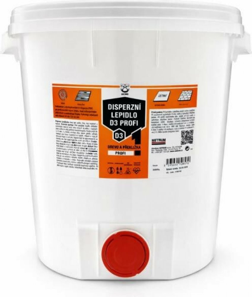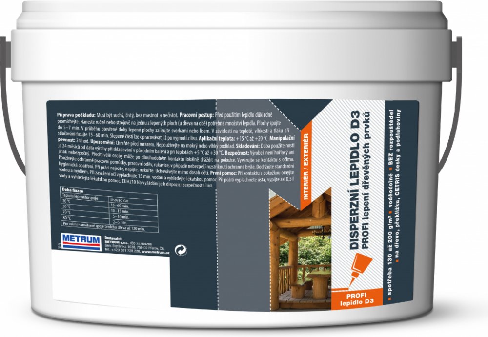 Disperzní PVA lepidlo D3 pro profesionální použití s vysokou odolností proti vlhkosti. Vhodné pro interiér i exteriér. Lepí měkké i tvrdé dřevo. Ideální lepení oken, dveří, zárubní. S tímto disperzním lepidlem lze lepit veškeré dřevěné plochy, jako např. schodiště, zábradlí, nábytek, okna a dveře včetně obloukových zárubní, plovoucí laminátové a dřevěné podlahy. Lze lepit plochy ze dřeva, CETRIS desek, překližky, dřevotřísky a takové podklady, kde je alespoň jedna plocha ze savého materiálu. Výsledkem je pevný spoj, odolný dlouhodobému působení zvýšené vlhkosti a krátkodobému působení tekoucí vody - kategorie D3 (ČSN EN 204). Produkt neobsahuje rozpouštědla a ftaláty. Je dobře mísitelný s vodou. Nejedná se o nebezpečný přípravek.