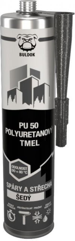 Jednosložkový polyuretanový tmel PU 50 Buldok v šedém provedení je určený pro elastické lepení a spárování stavebních i technických prvků. Vyniká vysokou přilnavostí k většině stavebních materiálů, jako je kov, beton, dřevo nebo plast. Balení 300 ml je vhodné pro standardní aplikační pistoli.