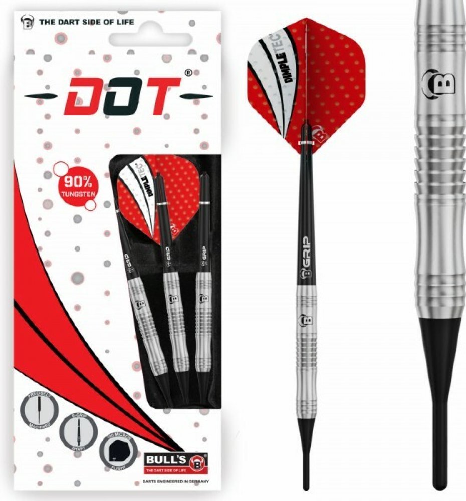 Bull's šipky DOT – je díky 90% wolframu velmi kvalitní sada na šipkové turnaje. Jsou dokonale tvarované a nabízí možnost výběru úchopu šipky, jsou vhodné pro vytvoření vlastní techniky hodu. Tyto šipky jsou k dispozici v různých gramážích a délkách. Najdete na nich vyryté logo BULL'S. Baleno v praktickém Bull's Cone Case. Násadky B-Grip SL a letky Dimpletec.Délka barelu = 42,9 mm D1 = 6,5 mm D2 = 6,5 mm. Varianty: 18388-18g.
