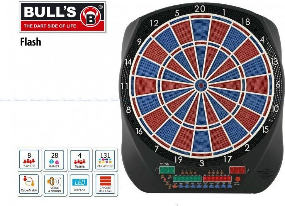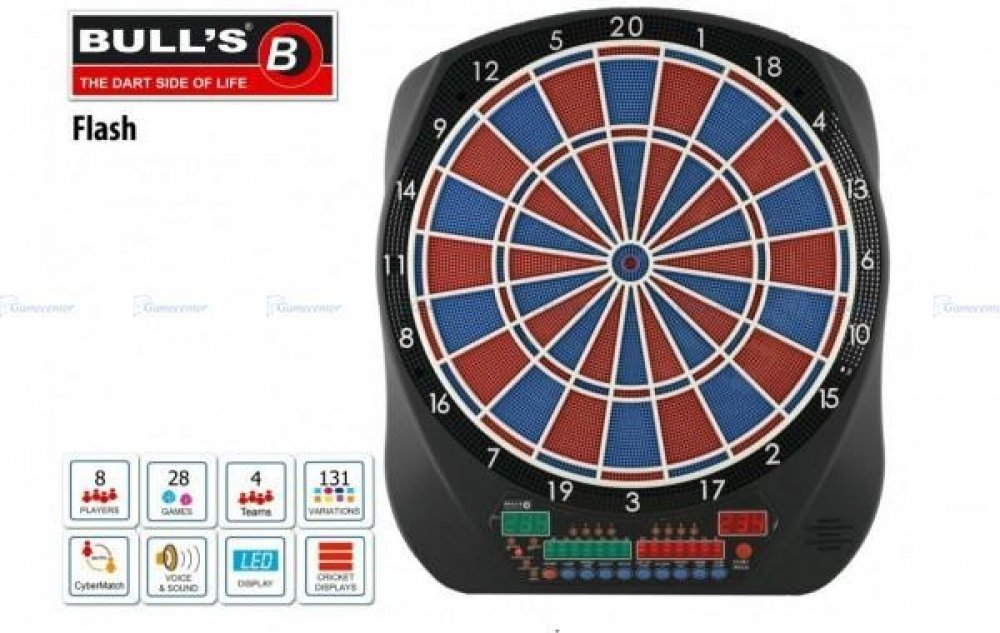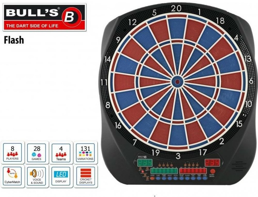 Elektronický dvouřádkový terč Bull's Flash je moderní a stylový dvouřádkový elektronický terč pro hru šipkami, který se vyznačuje čtyřmi LED displeji a originální turnajovou velikostí dvouřádkového segmentu a Bull's Eye. Je určen pro 1 až 4 hráče nebo 2 až 4 týmy a nabízí širokou škálu funkcí, které z něj dělají ideální volbu pro každého nadšence šipek.