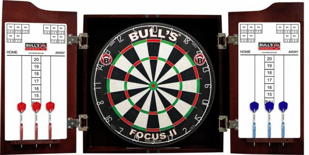 Bull's Kabinett Wood, velice kvalitně vypracovaný z pravého dřeva. Ve dveřích jsou dvě tabule k zapisování průběhu hry. Dodáváno bez terče a šipek.