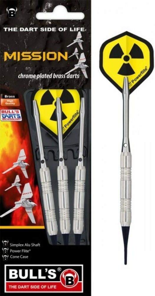 Bull's šipky Mission -mosaz mají mosazný povrch pro lepší uchopení šipky. Jsou k dispozici ve dvou různých gramážích. Šipky jsou vhodné pro mírně pokročilé hráče. Baleno v praktickém Bull's Cone Case. Násadky Simplex Alu, letky Power Flite. Délka= 49,4 mm D1= 7,8 mm D2= 7,8 mm. Varianty: 16536-16g, 16538-18g.
