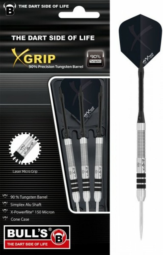 Bull's X-Grip - šipky jsou vytvořeny použitím nejnovější mikro-laserové technologie. Všechny typy barrelů mají speciální zóny k držení šipky, které umožňují hráči dokonalou kontrolu nad hodem. Typ X1 je k dispozici ve dvou různých gramáží a délkách s vyrytým logem BULL'S a nápisem Grip. Baleno v praktickém Bull's Cone Case. Násadky Simplex Alu a nové extra pevné letky X-Power Flite. Délka barrelu= 53,1 mm D1= 6,2 mm D2= 6,2 mm. Varianty: 14312-22g, 14314-24g.
