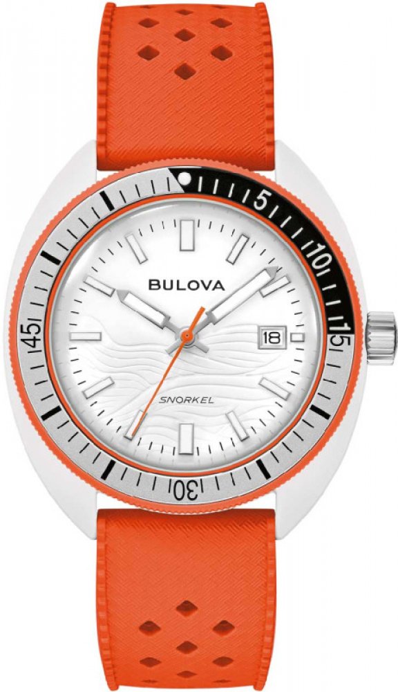 Kolekce Bulova Snorkel, která ctí dlouholetou tradici inovací a precizního řemeslného zpracování značky Bulova, spojuje historický design s moderním, svěžím pojetím. Tento znovuzrozený model čerpá inspiraci z ikonických hodinek Oceanographer, což se odráží v jeho klasickém, avšak nezaměnitelném tvaru pouzdra. Každé 41mm hodinky z této kolekce se pyšní retro siluetou pouzdra, vyrobeného z průlomového materiálu Hybrid Ceramic – luxusně hladkého kompozitu, který vyniká svou odolností. Ciferník s jemným vzorem vln a výrazné hybridní pouzdro dokonale doplňuje oranžový jednosměrný rámeček s dvoubarevnou vložkou. Zadní strana pouzdra je ozdobena detailním motivem ryby Clownfish, což vzdává poctu oceánskému dědictví této kolekce. Pánské hodinky Snorkel, vybavené stříbrnými ručičkami a indexy s luminiscenční výplní, ukazatelem data a stylovým oranžovým perforovaným pryžovým řemínkem, představují dokonalou harmonii nadčasového designu a funkčnosti. Díky vodotěsnosti do 100 metrů jsou tyto hodinky nejen stylovým doplňkem, ale i praktickým nástrojem, který ctí odkaz legendárních modelů značky Bulova.