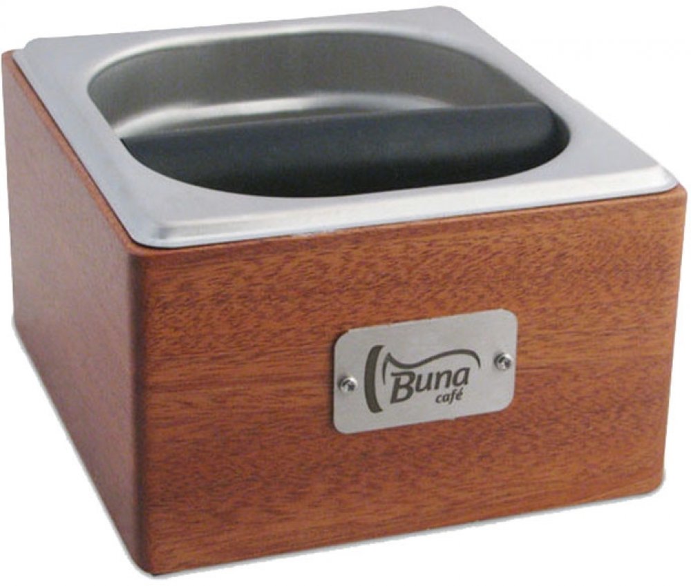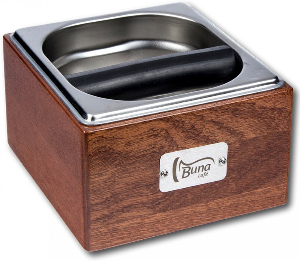 Dřevěný Knock Box s nerezovou nádobou a gumovou odklepávací tyčí o rozměrech 18,5x17,2x10 cm (hxšxv). Jednoduchá výměna gumové tyče (např. při opotřebení).