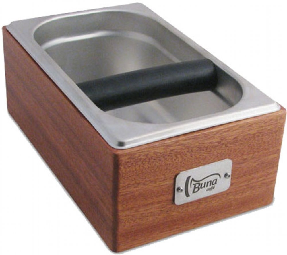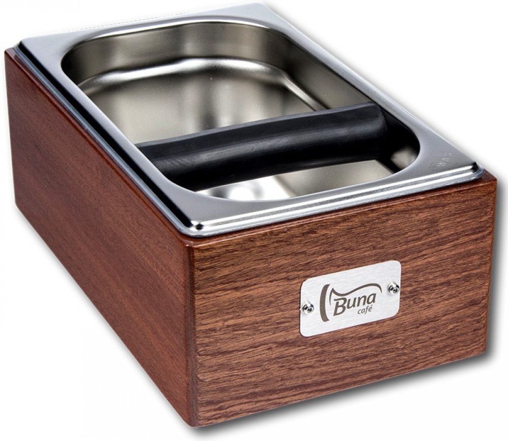 Dřevěný Knock Box s nerezovou nádobou a gumovou odklepávací tyčí o rozměrech 27,5x17,2x10 cm (hxšxv). Jednoduchá výměna gumové tyče (např. při opotřebení).