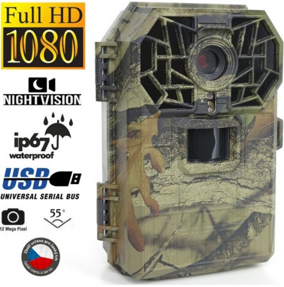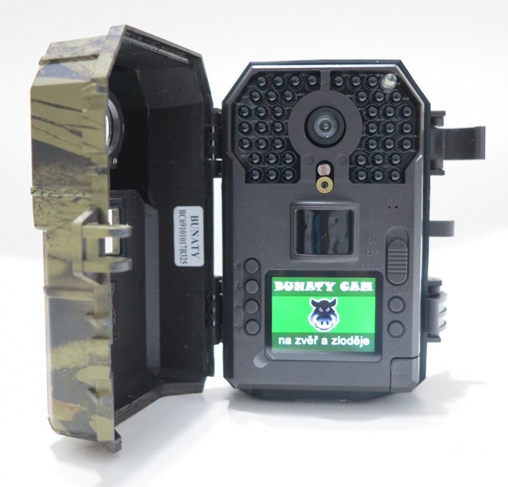 Fotopast se záznamem na sd kartu a úhlem snímání 80°. Fotopast se středně širokým úhlem záběru vhodná na kratší vzdálenost s pokrytím co největší plochy. Menu fotopast je v českém jazyce a je přehledně členěno. Nastavení tak zvládne opravdu každý. Veškeré záznamy - fotografie nebo videa sekvence jsou zaznamenány na sd kartu a to o kapacitě až 32GB. Fotopast má velký 2,4'' LCD displej, na kterém si pohodlně můžete záznamy prohlédnout. Na běžně používanou sd kartu o kapacitě 8GB se vejde až 9000 fotografií. Fotopast je vhodná i do nejnáročnějších podmínek. Odolá děšti, sněhu i mrazu. Kvalitní provedení plastů a dokonalá izolace je značce BUNATY vlastní. Fotopast pracuje na 8 klasických tužkových baterií, které jsou umístěny v samostatném boxu. Jsou zcela odděleny od elektroniky. Už se Vám tak nestane, že nekvalitní baterie „vytečou „ a poškodí tak celý přístroj. Samozřejmostí je také možnost připojení externího napájení. Konektor pro externí napájení je umístěn ve spodní části fotopasti, tím se zabrání vniknutí vlhkosti do elektroniky. Fotopast BUNATY WIDE Full HD je vybavena zesíleným nočním přísvitem o vlnové délce 940nm a to zaručuje, že ani při přímém pohledu za naprosté tmy není opravdu vidět, že Vás fotopast vyfotografovala.Fotopast, je tak vhodná na ochranu majetku, tak i na sledování zvěře. Fotopasti BUNATY se dobře maskují, více jak polovinu fotopasti můžete zcela zakrýt a ostatní části jsou velmi nenápadné s minimem lesklých ploch. Zaměření fotopasti je opravdu velmi snadné na velkém LCD displeji, který je umístěn na přední straně fotopasti. Přesně vidíte, co budete snímat a za zhoršených světelných podmínek si můžete vypomoci integrovaným laserovým ukazovátkem. Nemusíte tak již nic odhadovat jako u jiných značek. Kvalita fotografií o rozlišení 16MP a kvalita videa o rozlišení FULL HD patří mezi to nejlepší na trhu. Fotopast BUNATY WIDE FULL HD má mnoho dalších užitečných funkcí jako například časovač, kdy fotopast můžete nastavit pro focení jen v určitém časovém období například jen v noci.Časosběr je funkce, kdy fotopast bude pořizovat fotografie v pravidelném časovém intervalu – ideální pro monitorování velkých ploch. Na každé fotografii pořízené fotopastí je uveden informační údaj o tom, kdy a v kolik hodin byla fotografie zaznamenána. Sekvenční snímání Vám zajistí, že Vám opravdu nic neunikne - fotopast zaznamená pohyb a ihned pořídí, až tři fotografie rychle za sebou. Velkou výhodou fotopastí BUNATY oproti jiným dostupným značkám je její provedení a jednoduché logické ovládání a také kvalitní dobře dostupný vypínač a ovládací prvky na přední straně fotopasti. Fotopast BUNATY full hd dobře poslouží jak na ochranu majetku, tak i na sledování pohybu zvěře. Fotopast je vyrobena přímo pro českou republiku a i v české republice je zajištěn kvalitní servis . Fotopasti BUNATY používá více jak 200 měst a obcí v ČR a také státní policie!
