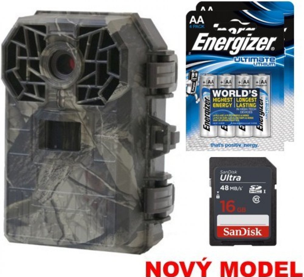 Kovový ochranný box, který ochrání fotopast před odcizením, 8GB sd kartu s kapacitou až 9000 fotografií a sadu základních baterií.