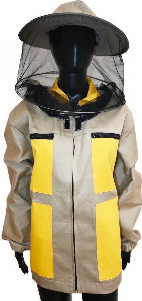 Blůza je vyrobena z pevné bavlněné tkaniny, která účinně brání průniku včelího žihadla. Spodní okraj blůzy i konce rukávů jsou staženy gumičkou, takže oděv bezpečně přiléhá k tělu a zabraňuje vniknutí včel pod oblečení. Rukávy jsou navrženy tak, abyste je mohli pohodlně zasunout do včelařských rukavic a vytvořit tak souvislou ochrannou bariéru. V oblasti krku jsou doplněny další ochranné prvky pro maximální bezpečí. Klobouk je s blůzou spojen odepínatelným zipem, což usnadňuje údržbu i samostatné použití jednotlivých částí.