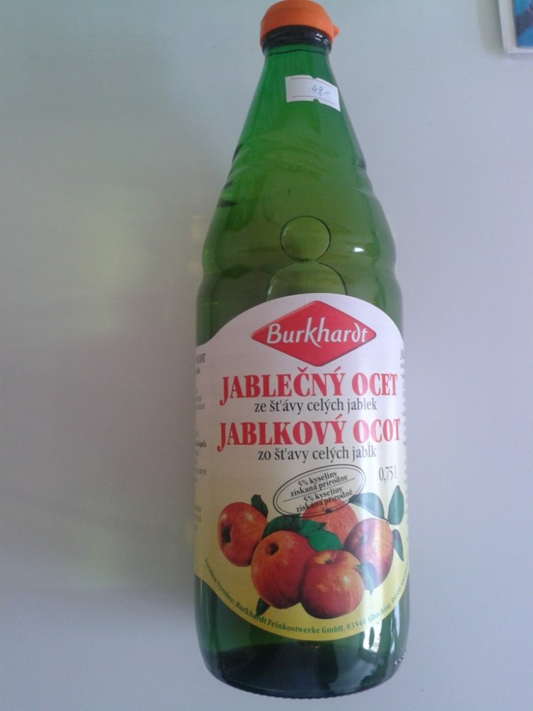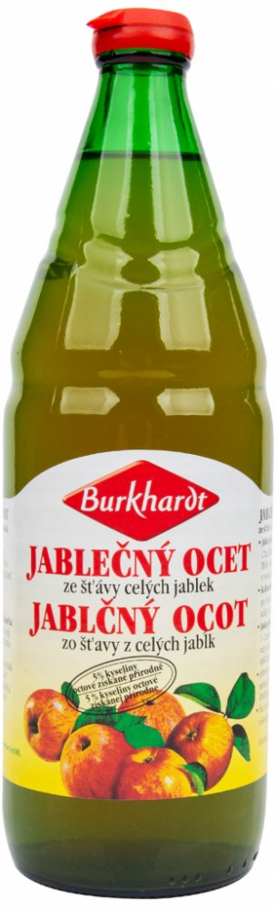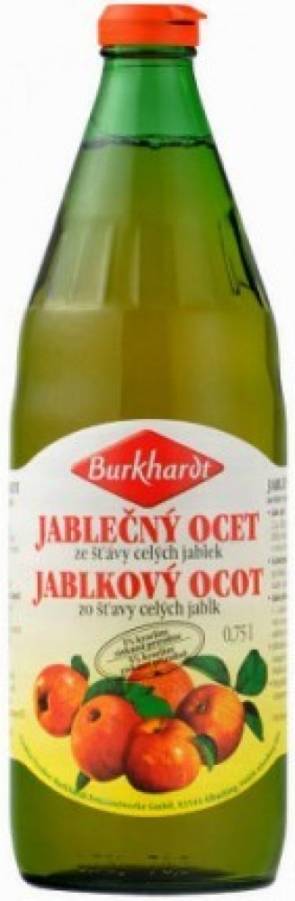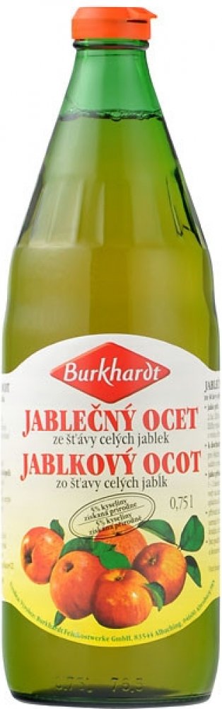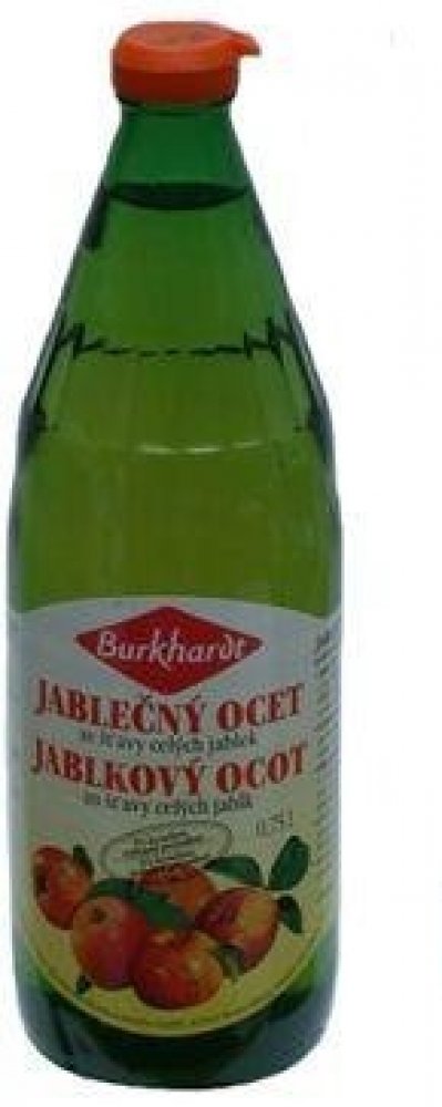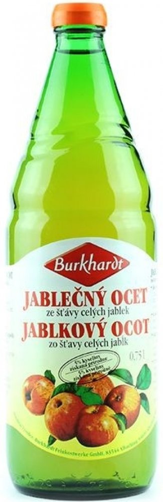 Jablečný ocet ze šťávy celých jablek. Vyroben bez použití chemických a konzervačních přísad. Jablečný ocet má stupeň kyselosti 5%. Složení: Jablečný ocet ze šťávy z celých jablek. Návod k přípravě: 2 čaj. lžičky a 2 čaj. lžičky medu rozředěné s vodou Denně před jídlem pijte 2 čajové lžičky jablečného octa BURKHARDT smíchané s 2 čajovými lžičkami medu. Používejte k dochucení salátů a mnoha jídel.