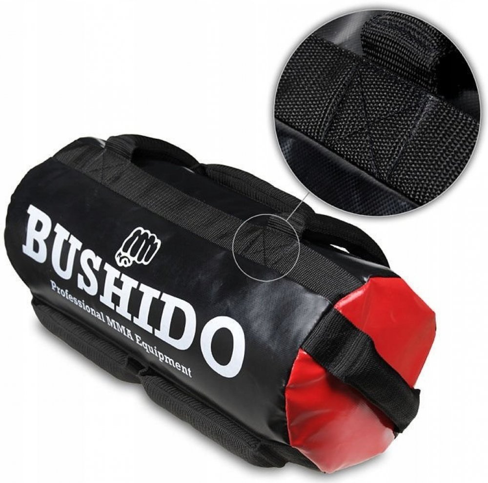 Sandbag je výborný díky své regulaci váhy. Dodává se prázdný a tuto vlastnost určitě ocení uživatel, který chce třeba cvičit na dovolené. V sestavě je dodáván i s třemi vysoce odolnými vaky, které lze naplnit až do hmostnosti 12 kg. Ideální náplní je písek nebo jemný štěrk. Sandbag Bushido je osazen 7 úchopy, které jsou vyplněné materiálem odolným proti roztržení. Každý úchop je přešitý extrémně p...