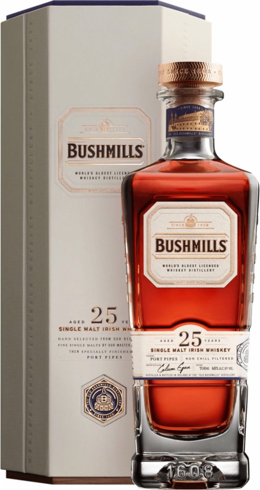 Bushmills 25 Year Old trpělivě zraje v sudech po bourbonu a sherry po dobu čtyř až šesti let a poté se dokončuje v ruby port pipe s prvním plněním po dobu 21 let. Vůně je bohatá a komplexní, nabízí intenzitu černého ovoce s jemným nádechem medu a lehce opáleného dřeva. Chuť je velmi jemná s tóny sladkých mandlí, karamelizovaných třešní, sušených švestek a ostružin, hořké čokolády smíchané se sladk...
