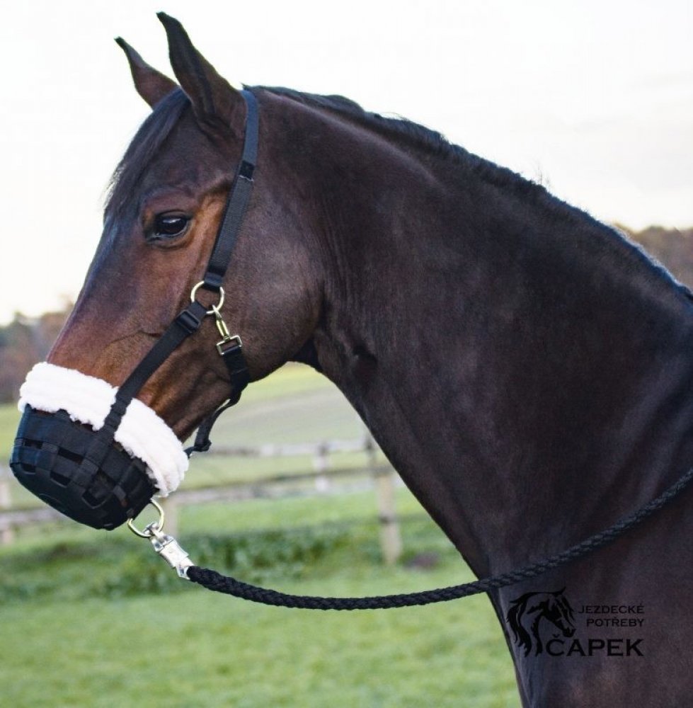 Náhubek s měkkým beránkovým lemem pro maximální komfort vašeho koně. snížení příjmu potravy, zejména na pastvě ideální pro koně trpící obezitou, schvácením kopyt atd. obložený měkkou umělou kožešinou, aby se zabránilo tlaku a tření v oblasti hřbetu nosu a dolní čelisti dobře větrané, vyrobené z odolného popruhu včetně velikostně nastavitelné páskové ohlávky zapínání na karabinu kroužek pro uchycen...