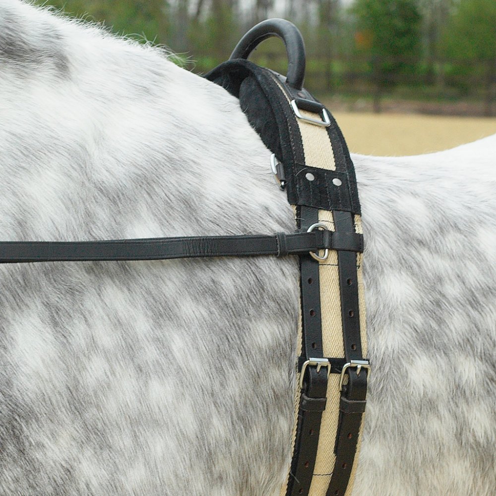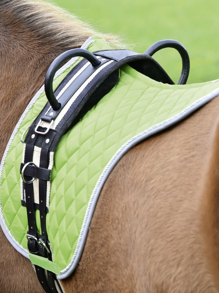 Lonžovací obřišník s jedním madlem. Obřišník je vybavený pevným madlem, které je potaženo kůží. Výška madla: 10cm. Obřišník je dále vybavený několika kroužky pro upevnění tréninkových pomůcek. Dva čtvercové úchyty po stranách slouží k upevnění třmenových řemenů a třmenů (není vhodné pro nasedání). K dispozici více barevných variant a velikostí.