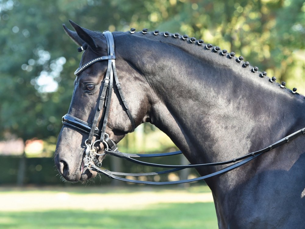 Moderní, vysoce kvalitní, kožená dvojitá uzda s lesklým, měkce polstrovaným švédským nánosníkem s válečkovými přezkami z nerezové oceli. Čelenka je zakřivená, zdobená třpytivými kamínky. Nátylník je široký, měkce polstrovaný pro optimální rozložení tlaku. Dodáváno včetně dvou sad kožených otěží.