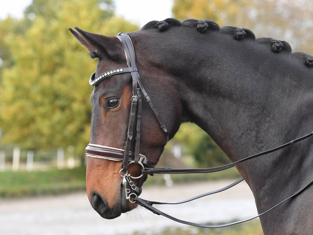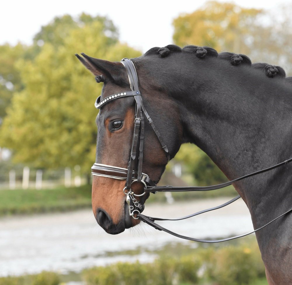 Moderní, vysoce kvalitní, kožená dvojitá uzda s lesklým, měkce polstrovaným švédským nánosníkem s válečkovými přezkami z nerezové oceli. Čelenka je zakřivená, zdobená třpytivými kamínky. Nátylník je široký, měkce polstrovaný pro optimální rozložení tlaku. Dodáváno včetně dvou sad kožených otěží.
