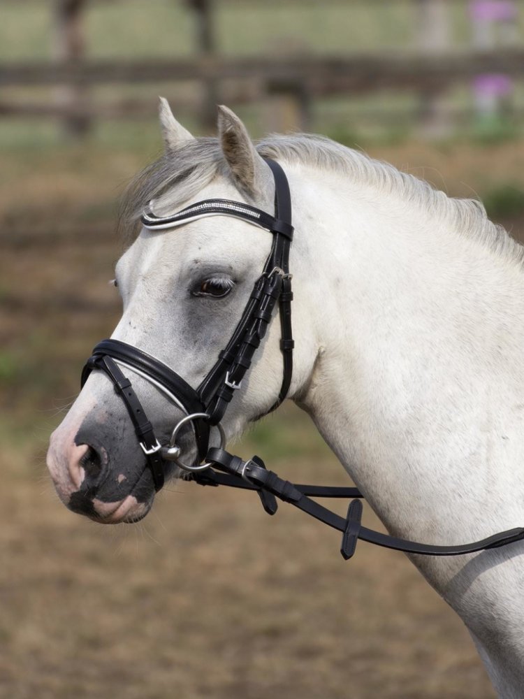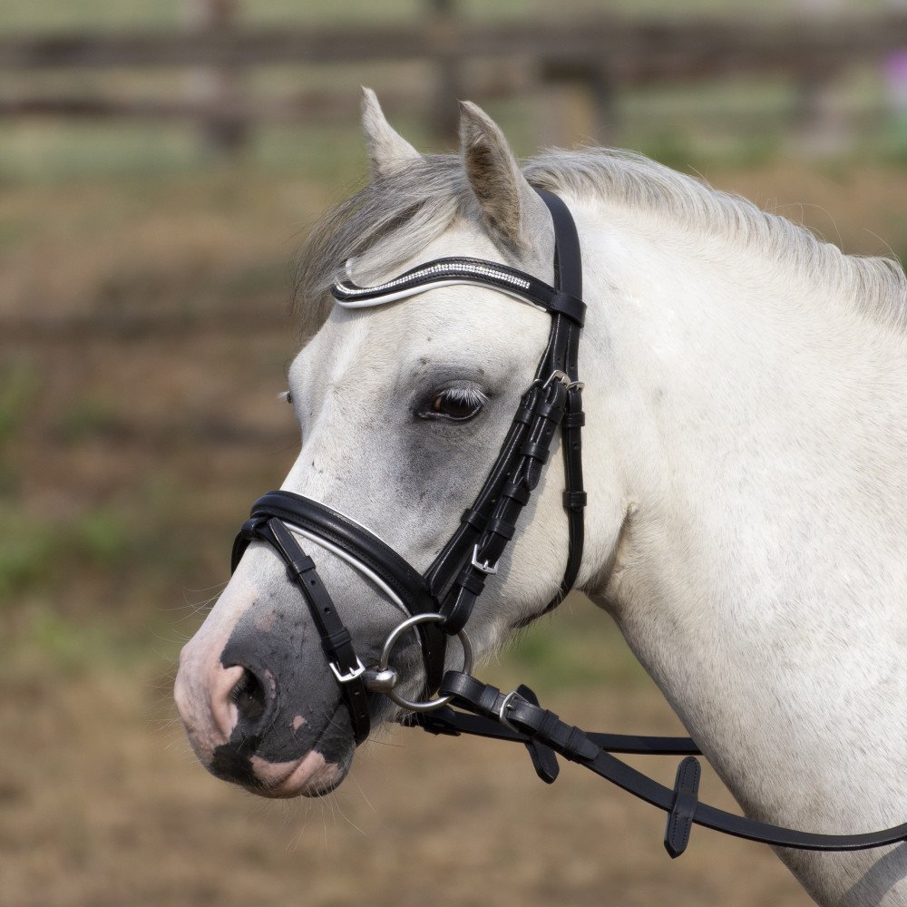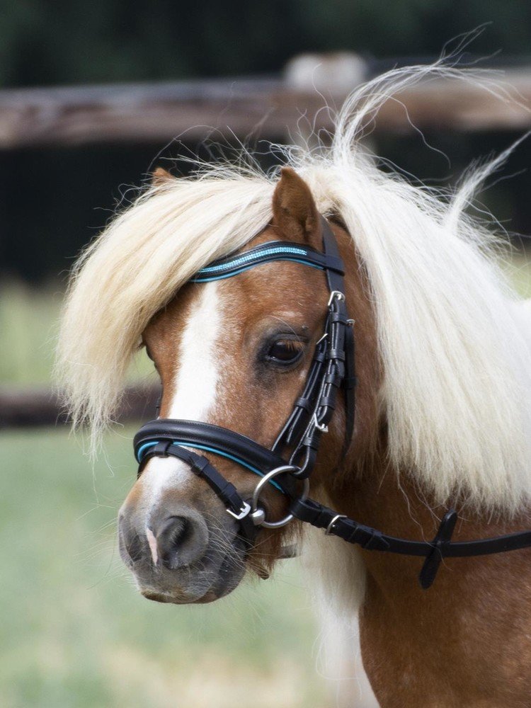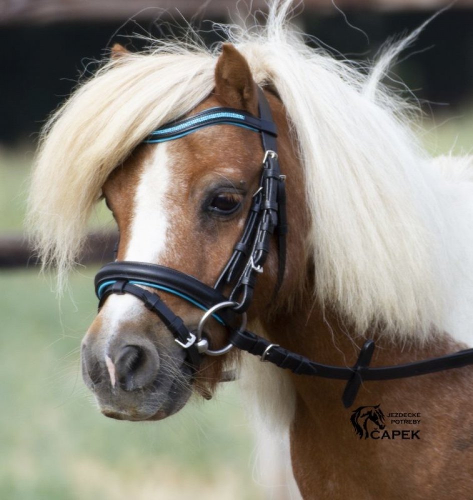 Hezká uzdečka vyrobená speciálně pro malé poníky. Nánosník a čelenka mají měkké podložení ve stejné barvě, v jaké jsou na čelence kamínky. Součástí uzdečky jsou plátěné otěže. Velikosti: Shetty a Minishetty. Barva: černá/azurová, černá/růžová, černá/bílá.