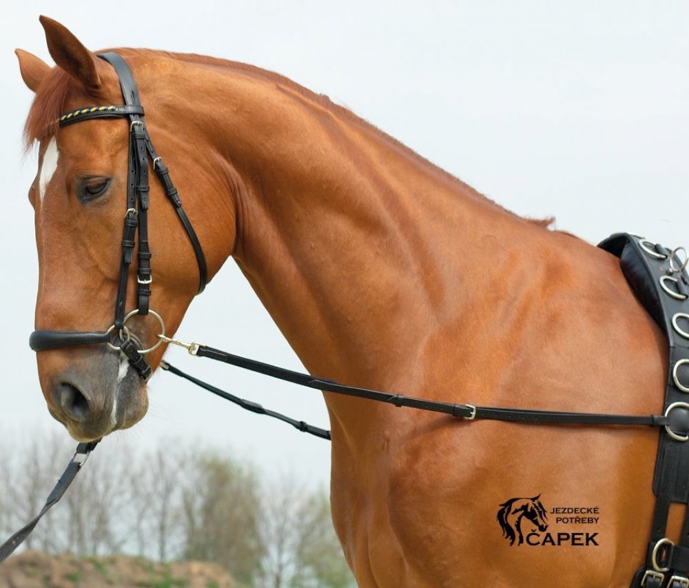 Vyvazovací kožené otěže s elastickými částmi. dvě kožené otěže na vyvazování na boku s elastickými konci z dvojité gumy délka nastavitelná pomocí přezek otočná karabina pro připnutí k udidlu nerezové přezky šířka řemínku: 18 mm délka: pony 75-90 cm ; full 85-105cm