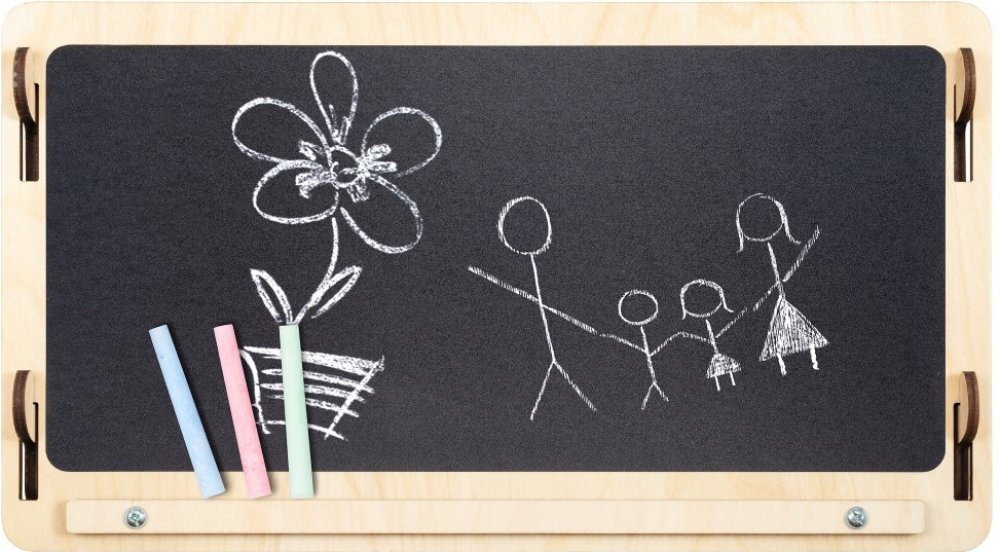Když už máte vlastní domeček, je třeba si jej také vyzdobit dle vlastního vkusu! Proto jedna část střechy slouží jako tabule pro kreslení křídami. Kreativita se snoubí s tréninkem ruky pro budoucí školní povinnosti.