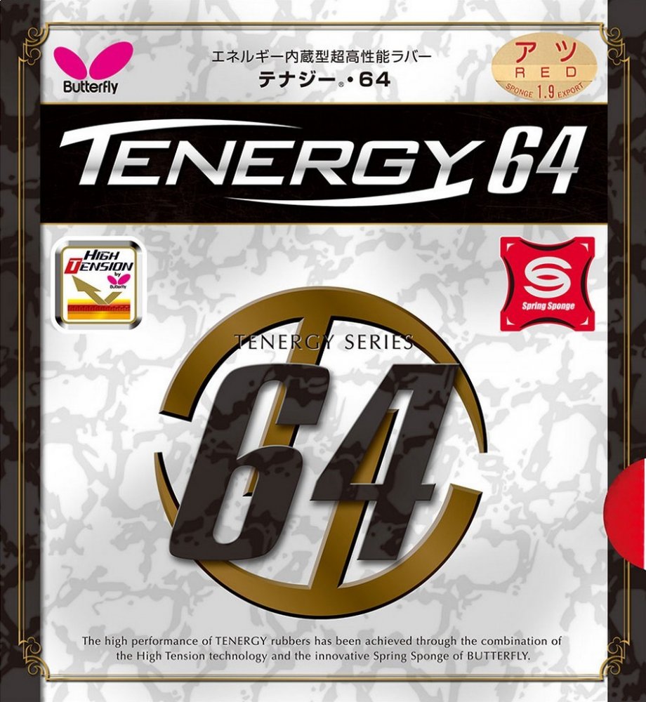 Butterfly Tenergy 64 - rychlejší než verze Tenergy 05, měkčí houba oproti Tenergy 05. Technologie výroby houby High Tension byla doplněna novým patentem Spring Sponge. Potah na útočnou, topspinovou hru, především ze střední vzdálenosti od stolu. Geometrie vroubků vrchní gumy je oproti Tenergy 05 pozměněna, špunty jsou tenčí a mají větší rozestupy. Potah je tak rychlejší a točivější .