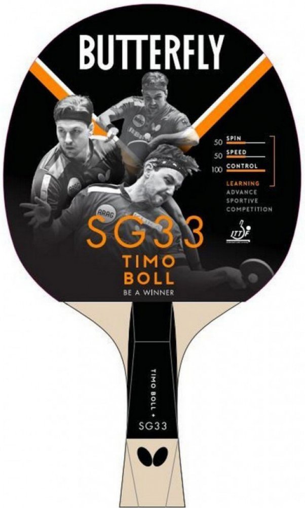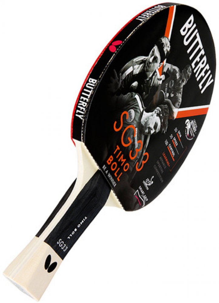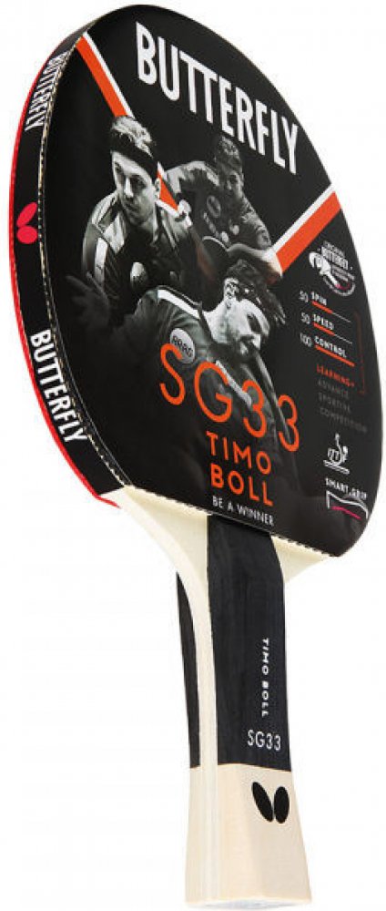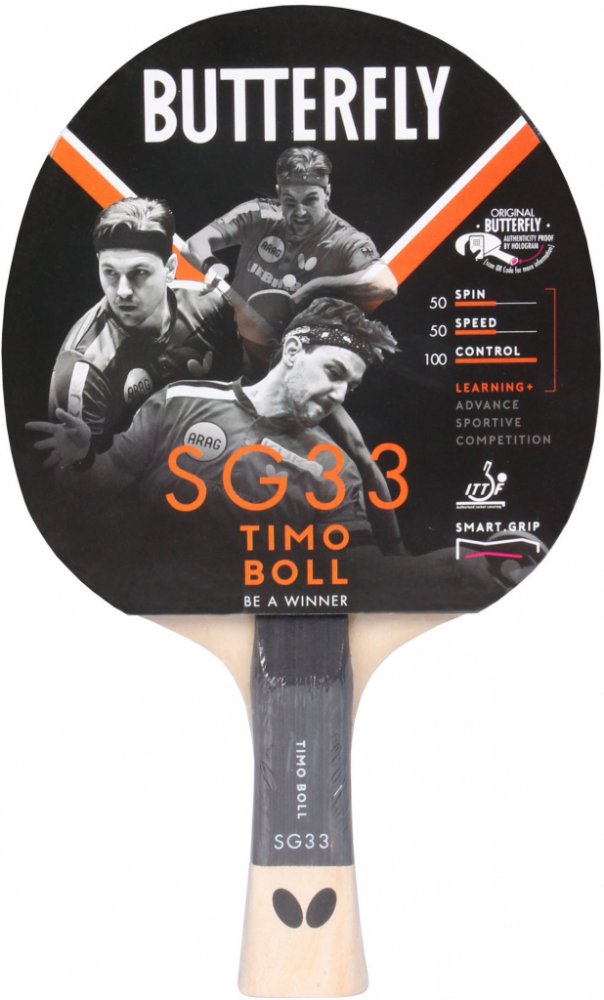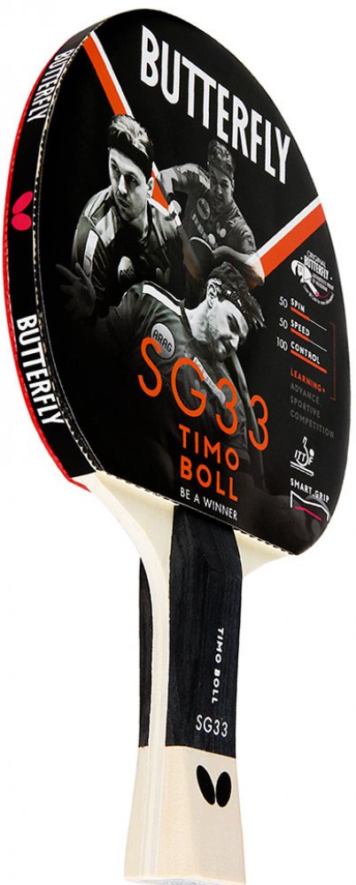 Pálka na stolní tenis BUTTERFLY Timo Boll SG33 pro vyspělé rekreační hráče. Univerzální pálka s vysokou kontrolou potahů Addoy s houbou o síle 1,7 mm. Držátko vyrobené technologií Smart Grip má unikátní tvar zúžený uprostřed. Díky tomu pálka neklouže v ruce a zlepšil se pocit míčku na pálce při odehrání úderu. Držátko: konkávní (FL).