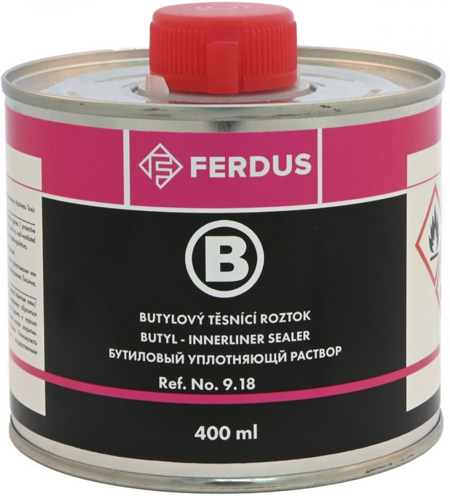 Těsnící roztok pro bezdušové pneumatiky. Objem 400 ml. Butylový těsnící roztok B je vyroben z butylového kaučuku, který nepropouští vzduch. Roztok slouží k utěsňování hustícího vzduchu v bezdušových pneumatikách v případech: