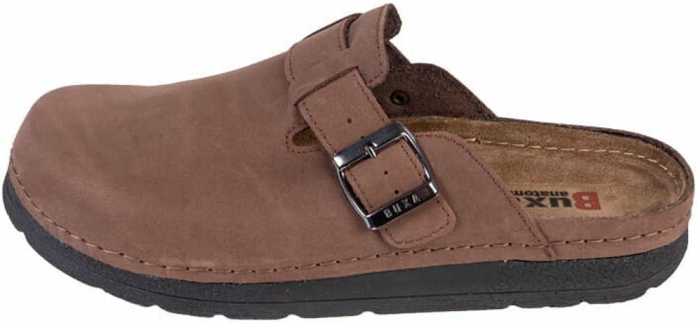 Pánské pantofle Buxa BZ420 jsou vyrobeny z přírodní broušené kůže, která zajišťuje dlouhou životnost i výjimečné pohodlí při každodenním nošení. Anatomicky tvarovaná kožená stélka podporuje zdravé postavení chodidla díky třem klíčovým zónám: podélná podpora klenby, příčná podpora klenby a podpora prstů. Díky prohlubni v oblasti paty je došlap stabilní a přirozený, což pomáhá předcházet únavě nohou. Pod pod koženou svrchní částí stélky se nachází měkká pěnová vrstva, která zvyšuje komfort i při delším stání nebo chůzi. Pantofle mají zvýšené okraje pro ochranu prstů a nastavitelnou přezku přes nárt. Ručně přišitý svršek zaručuje pevnost, odolnost a dlouhou životnost obuvi.